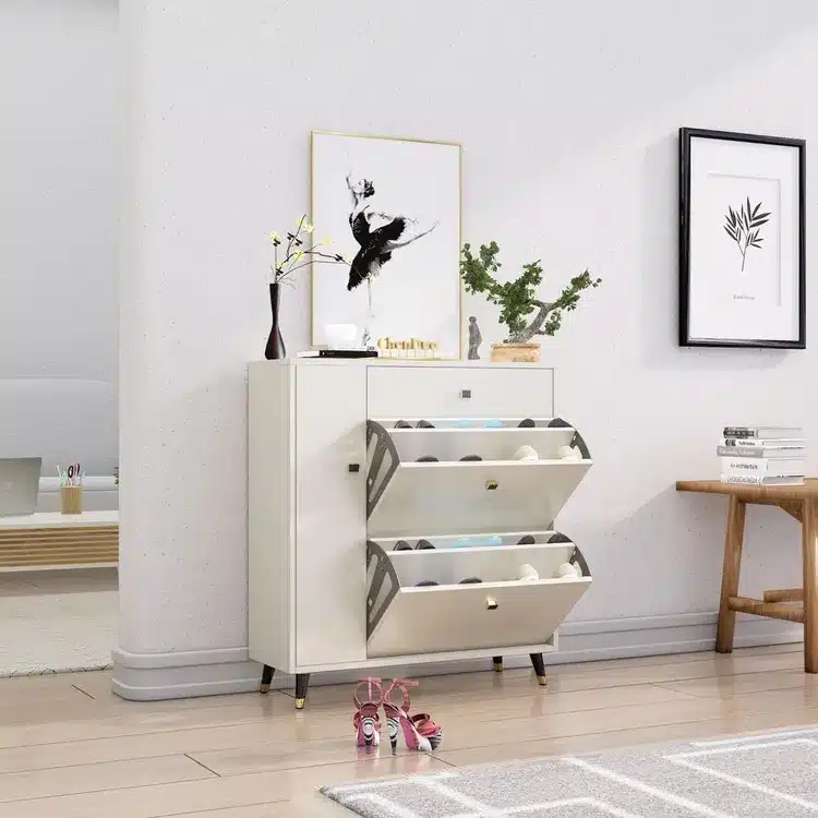 This cabinet features a flip drawer shoe storage system, allowing you to store multiple pairs of shoes in a compact and organized manner. The tilt-out drawers open smoothly, providing easy access while keeping shoes hidden from view. This design helps maintain a clean and clutter-free look in your home.