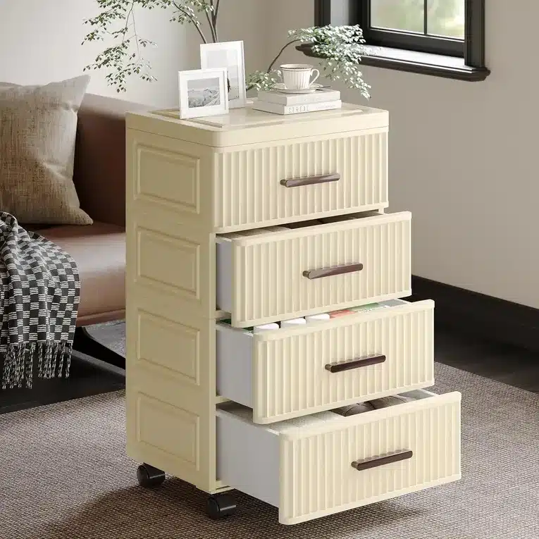 The cabinet is equipped with smooth-rolling wheels, allowing you to move it effortlessly from one place to another. This makes it ideal for dynamic spaces where flexibility and mobility are important, such as bedrooms, living rooms, or work areas.