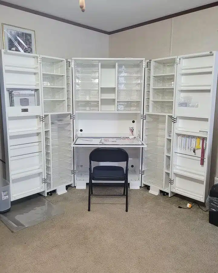 This cabinet features multiple compartments, drawers, and adjustable shelves, allowing you to neatly organize everything from fabrics, tools, papers, threads, and accessories to small craft supplies. The transparent storage bins and categorized sections ensure that every item has its place and is easy to access.